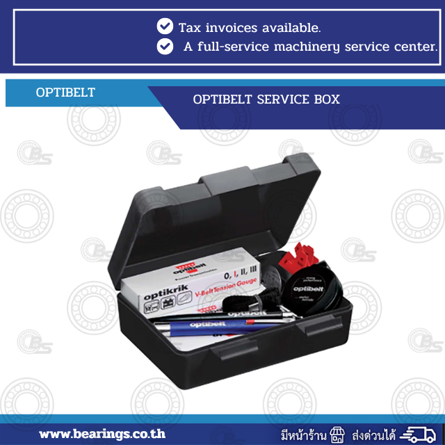 OPTIBELT SERVICE BOX includes valuable commonly used manual tools: (4) OPTIFRIK 0-1-2-3, tape measure, pen, sheave measurement gauges (v-belt and ribbed). Contact an Optibelt representative for ordering information