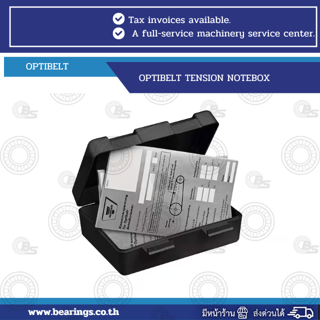 The OPTIBELT TENSION NOTEBOX, used for recording tension values of operating equipment, is often included in service kits, which typically consist of:
