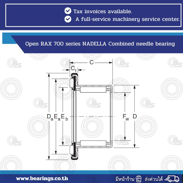 Nadella combined needle bearings type RAX 700 series and their derivatives are specifically designed to support both radial and axial loads simultaneously. They consist of a needle thrust bearing (or roller thrust bearing) combined with a needle cage, all integrated within a single outer ring.